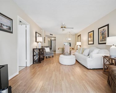 Welcome to Cross Fox Condominiums — a hidden gem just east of US-1 and minutes from the beach! This charming second-floor unit offers a bright, open layout with a split-bedroom design, ceramic and carpeted flooring, and a screened balcony overlooking lush garden views. The kitchen features an electric range, dishwasher, and refrigerator, flowing seamlessly into the dining and living area. Enjoy resort-style amenities including a community pool, clubhouse, fitness center, sauna, library, and hot tub. Maintenance includes building exterior, insurance, and more. Furniture is negotiable. Association requires approval; no leasing permitted for the first two years. Live the relaxed coastal lifestyle in a well-maintained, peaceful community close to shopping, dining, and entertainment.